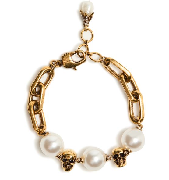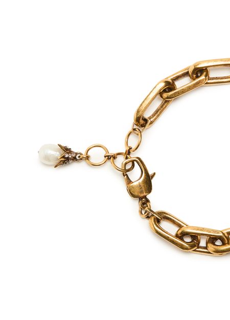 Reveal Alexander McQueen's beaded chain bracelet, a modern statement with lustrous pearl details and a refined gold finish. The snap-hook closure ensures a secure fit, while the elegant design brings a sophisticated edge to any ensemble. Perfect for elevating your jewelry collection with contemporary flair.