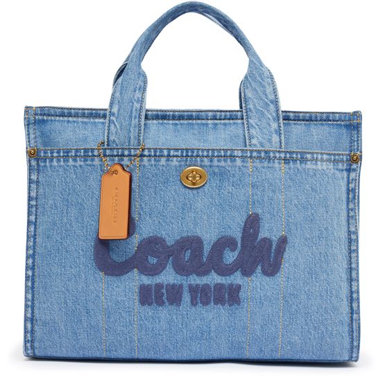 Coach's Cargo tote in denim features a front logo and embroidered logo for a classic touch. Visible topstitching adds detail to the design, while a wide strap allows for comfortable hand carrying or wearing on the shoulder. The zipper closure secures the single compartment with a luxurious gold finish, making it a versatile shopper/tote bag option.