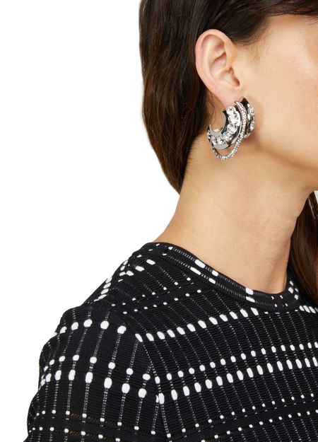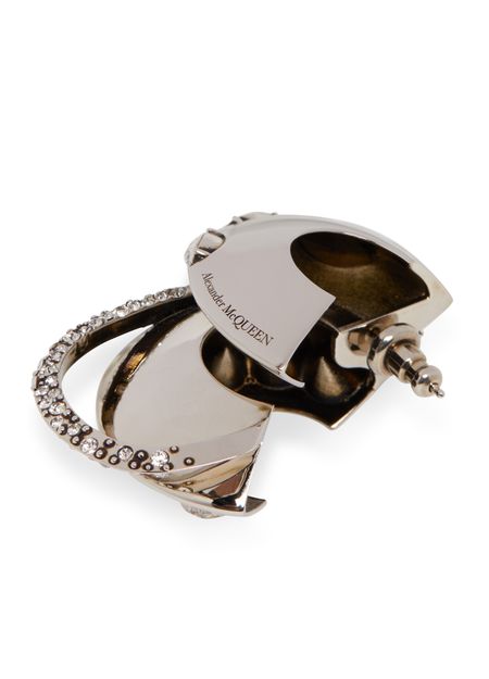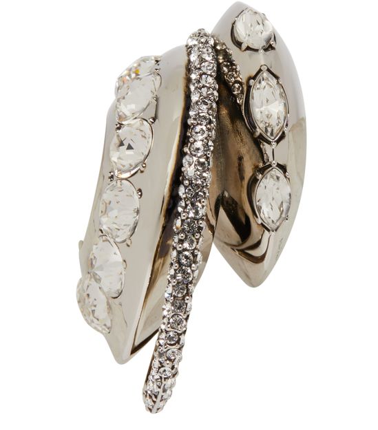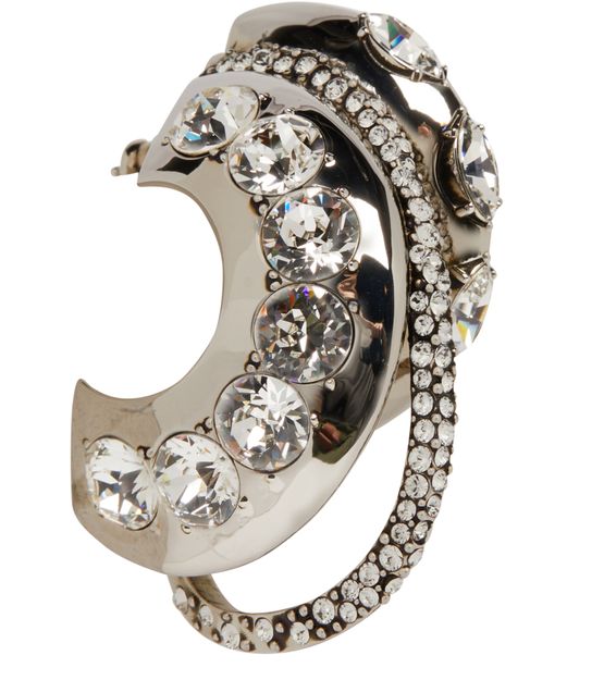 Experience the avant-garde elegance of Alexander McQueen's asymmetric crystal earcuff. The stunning design features delicate gemstones and a built-in clasp at the back for secure wear. Sold individually, this statement piece exudes the brand's signature edgy aesthetic, making it a must-have accessory for adding a touch of glamour to any ensemble.