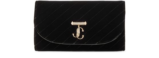 Reveal Jimmy Choo's Curve wallet with chain, a statement piece with a gold finish and metallic logo on the front. The magnetic flap closure secures a single compartment, while visible stitching and a zippered interior pocket add refined detail and practical elegance to this modern accessory.