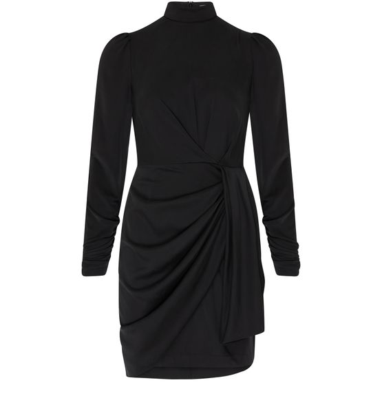 • Description : back zipper closure, draped detail, visible stitching, mini dress, appliquéd logo, long-sleeved, mockneck, cocktail & evening, highlighted waist.