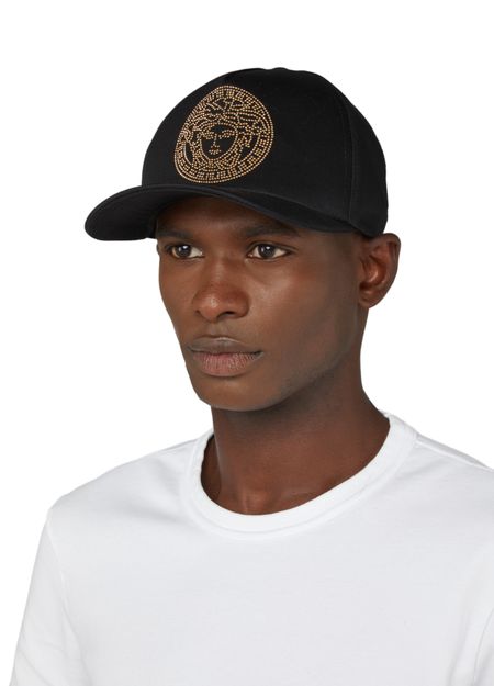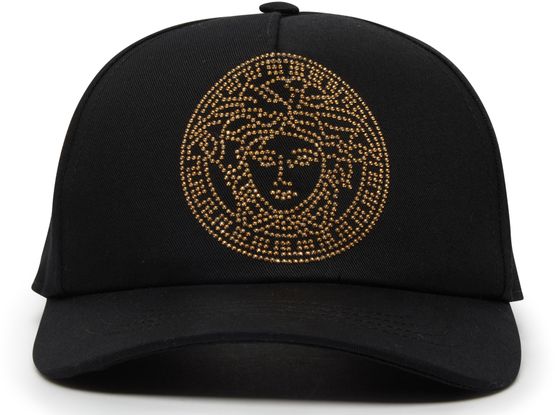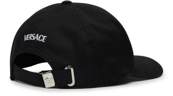 Versace's Embroidered Medusa baseball cap showcases a six-panel design that exudes style and sophistication. With an adjustable tab for a customizable fit, the curved visor offers sun protection. Visible topstitching adds a refined touch, while the iconic logo embroidered on the front makes a bold statement of luxury and elegance.