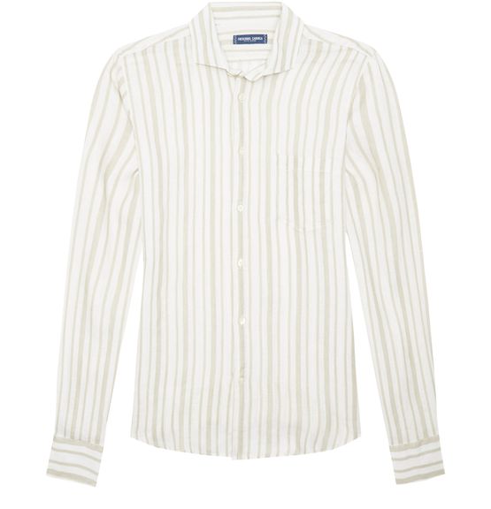 Description : logo at the back label, front buttoned closure, button fastening, long-sleeved, shirt collar, striped print, cuffed sleeves, buttoned cuffs.