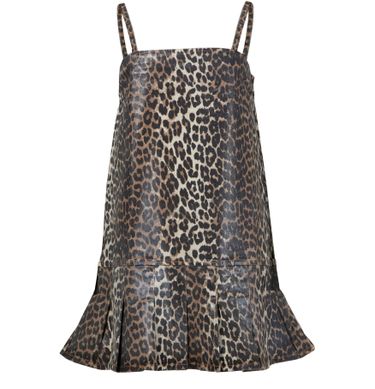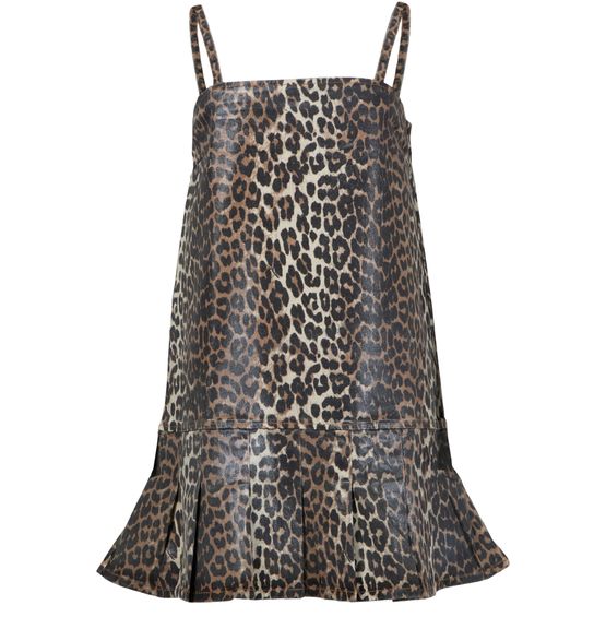 Ganni's foil print denim strap dress showcases a playful mini dress silhouette with a rectangular neckline and sleeveless design. Thin shoulder straps enhance its delicate charm, while visible stitching adds a touch of detail. The bold animal print makes it a standout piece, perfect for effortless summer styling and memorable outings.