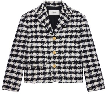 Unveil Celine's Garance jacket in houndstooth wool natté. This classic piece features a tailored fit with shoulder pads and a notch collar, complemented by two flap pockets and three distinctive blason buttons for a refined touch.