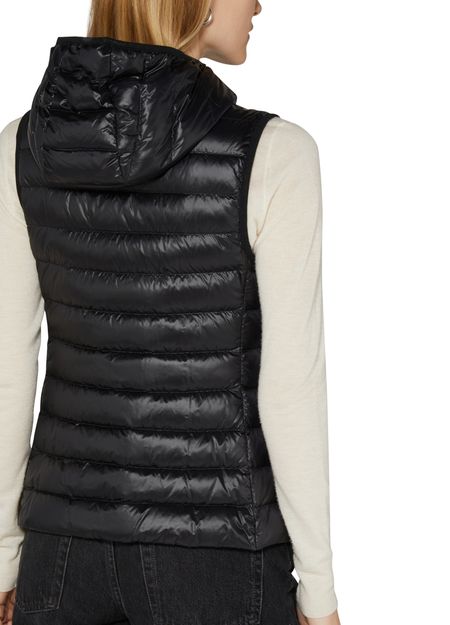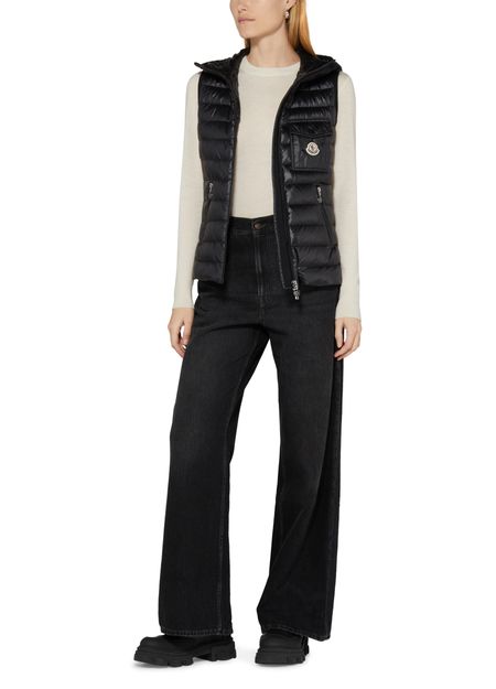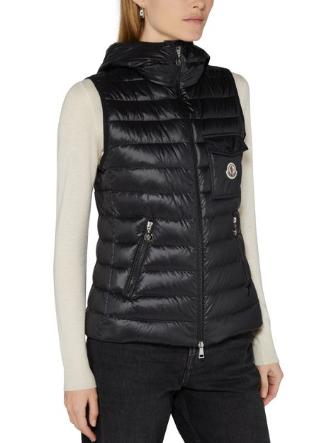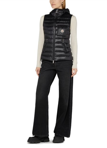 Moncler's Glygos sleeveless puffer jacket is a stylish and functional addition to your wardrobe. It features a zipper closure, embroidered chest logo, flap pockets, side pockets, and a convenient breast pocket. The jacket also comes with a hood for extra protection against the elements. Stay warm and fashionable in this sleek sleeveless design.