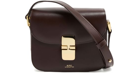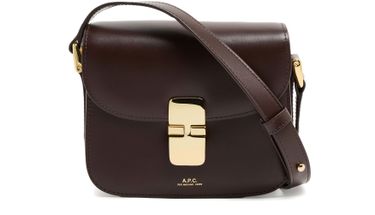 APC's Grace mini bag showcases a chic flap closure and a striking front logo in gold letters. Its single handle and thin strap allow for effortless crossbody wear. Crafted with visible topstitching and an adjustable strap, this bag combines style and functionality, making it a perfect accessory for any occasion.