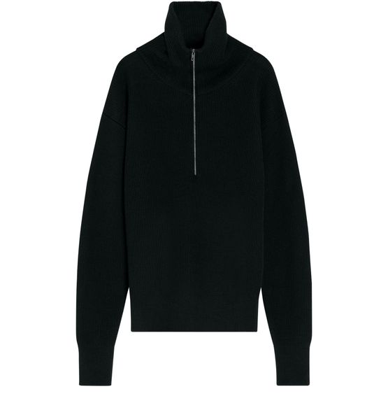 Reveal Lemaire's half zip sweater, a masterpiece of modern design. This long-sleeved sweater features a high-neck and zipper closure, offering a sleek silhouette. Crafted with ribbed material and visible stitching, it effortlessly combines style and comfort, making it a versatile addition to any wardrobe.