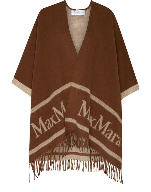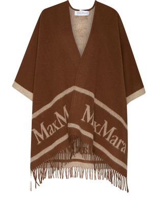 Max Mara's Hilde logo poncho showcases a mid-length silhouette with three-quarter sleeves, perfect for effortless layering. Adorned with fringe details, it features a striking front logo and a printed logo at the back, blending style and sophistication for an elevated look that transitions seamlessly from day to night.