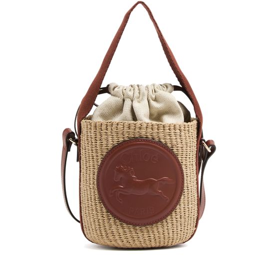 Chloé's Horse Medal basket is a charming small bucket bag designed for versatility. Its drawstring closure secures a single compartment, while double handles and a thin strap allow for hand carrying or shoulder wear. The front logo and appliquéd logo showcase elegance, complemented by visible topstitching for refined detail.