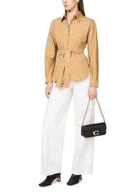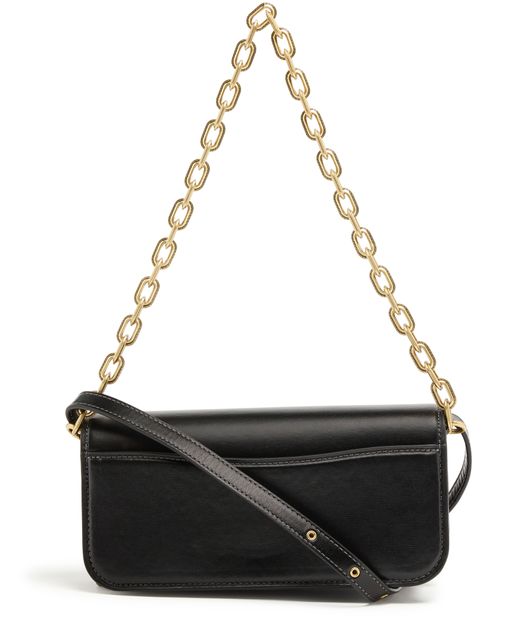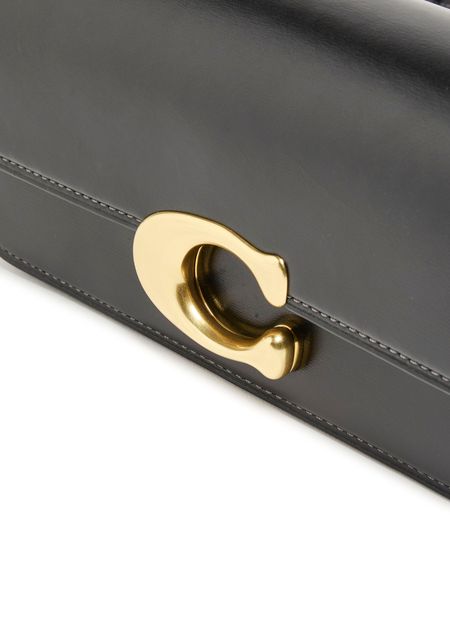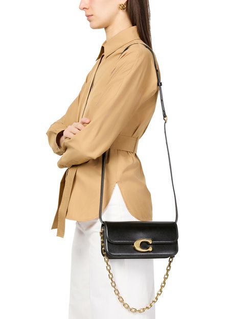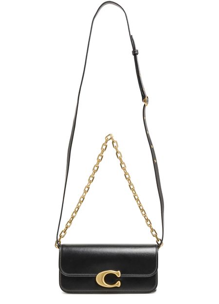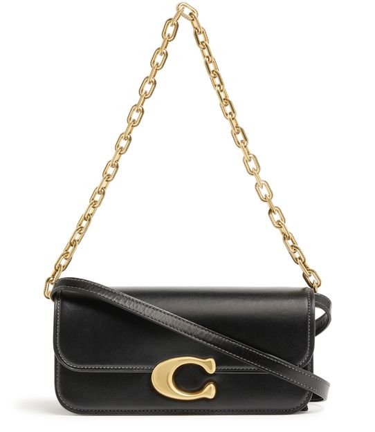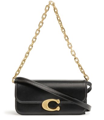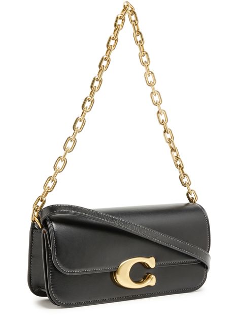 Coach's Idol shoulder bag 23 showcases a sleek design with a metallic logo on the front and a logo in gold letters on the side. Its flap closure opens to a single compartment, while visible topstitching adds elegance. Worn crossbody or on the shoulder, it features a single handle and a stylish chain strap with a gold finish.