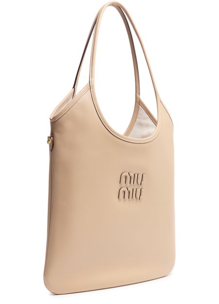 Reveal Miu Miu's Ivy leather bag, crafted from smooth leather with a padded texture and adorned with printed Miu Miu lettering. Double handles and a zippered interior pocket offer both style and practicality, while visible stitching and a large compartment complete this modern tote’s refined appeal.