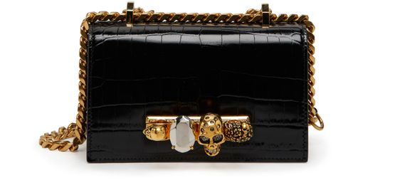 McQueen's Jewelled Satchel mini shoulder bag showcases exquisite crocodile-embossed leather, elevating any outfit. Its adjustable chain strap allows versatile styling, while the decorative chain adds a touch of glamour. With a secure flap closure and the brand's signature pattern, it can be worn on the shoulder or crossbody for effortless elegance.