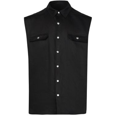 Rick Owens's Jumbo sleeveless jacket showcases a front buttoned closure and a stylish shirt collar, perfect for layering over casual shirts. Its visible stitching adds a unique touch, while flap pockets and a breast pocket provide practicality, making it an essential piece for those who appreciate bold, avant-garde fashion.