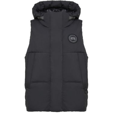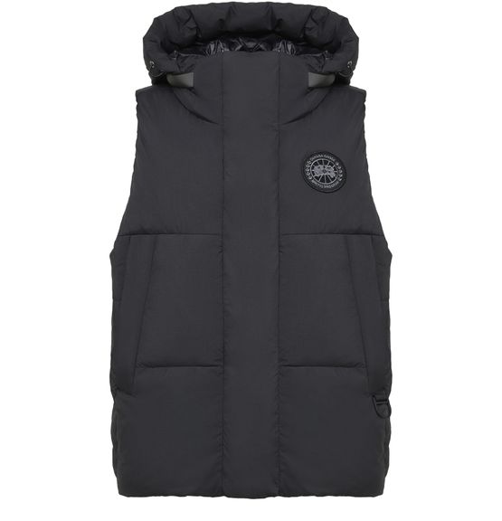 Canada Goose's Junction puffer vest showcases a sleeveless design with a concealed closure for a sleek look. Its padded texture offers warmth, while the chest logo adds a touch of style. The short cut and hood provide versatility, complemented by practical side welt pockets for convenience on the go.