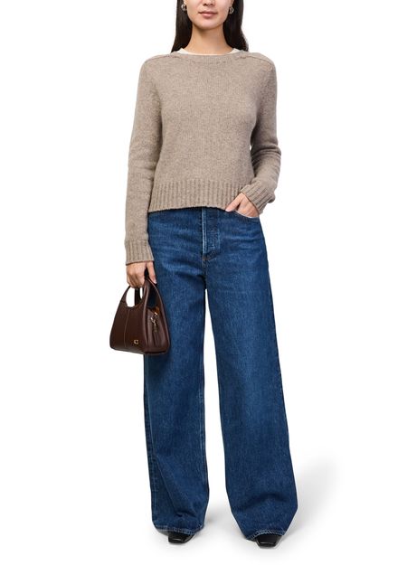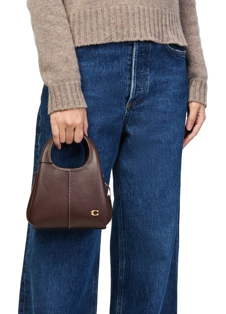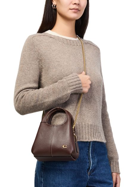 Reveal Coach's Lana 19 shoulder bag, crafted from grained leather with a decorative label and signature "C" detail. The gold finish, double handles, and detachable chain strap offer versatile styling, while the contrast lining and interior pocket add refined functionality to this modern accessory.