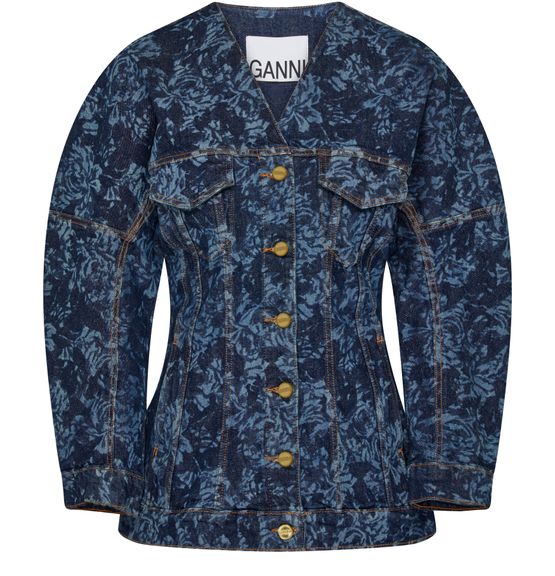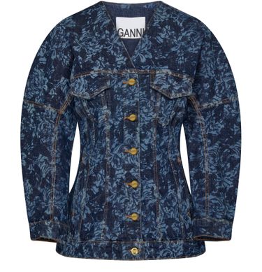 Ganni's Lazer denim blazer showcases a short, long-sleeved silhouette with a stylish front buttoned closure. Flap pockets and a breast pocket add practicality, while the all-over printed design and logo at the back label elevate its casual charm. The gold finish details bring a touch of elegance to everyday wear.