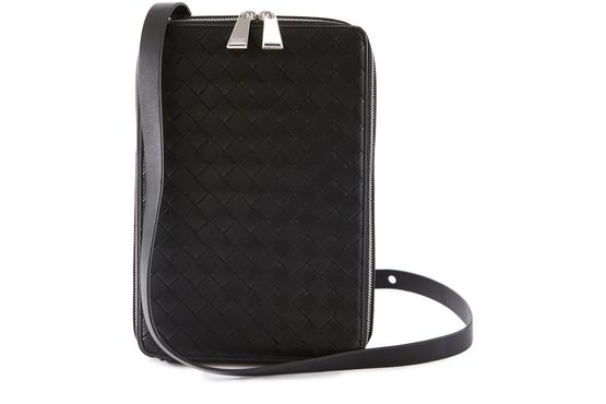 This lambskin messenger bag is by Bottega Veneta. It can be worn over the shoulder or cross-body and the rectangular shape with rounded corners is enhanced by the woven leather. With a double zip fastener, it has a long adjustable strap so it can be worn with anything.