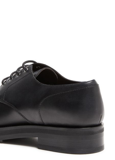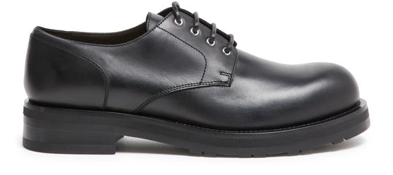 Reveal The Row's lug sole derbies in leather, crafted from smooth leather with a refined round toe and closed design. The low block heel and notched sole offer both comfort and modern edge, while visible stitching and a printed logo add signature detail. Laces and strap ensure a secure fit.