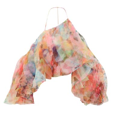 • Description : Multicolor print, bare shoulder, ruffled sleeve, short-sleeved, layer over a top, ruffle details.