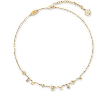 The LV In The Sky necklace beautifies the neck with a constellation of miniature House icons. On a fine gold-tone brass chain, the LV Initials are flanked by Monogram Flowers and sparkling square crystals. LV Circle and LV Circle charm add an extra signature flair. A refined jewel that radiates contemporary elegance.