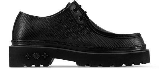 The LV Ranger derby offers a casual city look with its chunky, treaded outsole in ultra-light micro. The upper comes in Epi XL leather, an oversized version of Louis Vuitton's emblematic Epi leather, which was first seen at the Fall-Winter 2023 men's show. This model is finished with thick textile laces, while the heel is decorated with three Monogram Flowers.