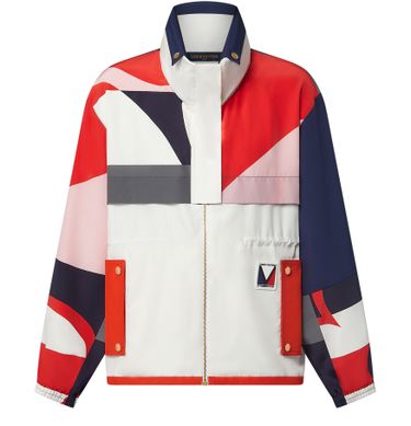 Bold signatures from the LV x America's Cup 2024 capsule elevate this parka into a sporty statement: Cut from lightweight silk, scaled-up, abstracted Monogram motifs form the colorful geometric print across the sleeves and shoulders, while the front, back and neckline are color-blocked for a graphic look. Complete with a foldaway hood, fastened side pockets and an adjustable waist.