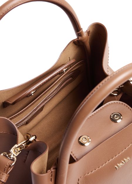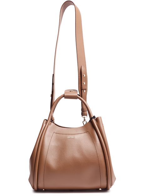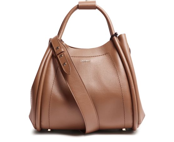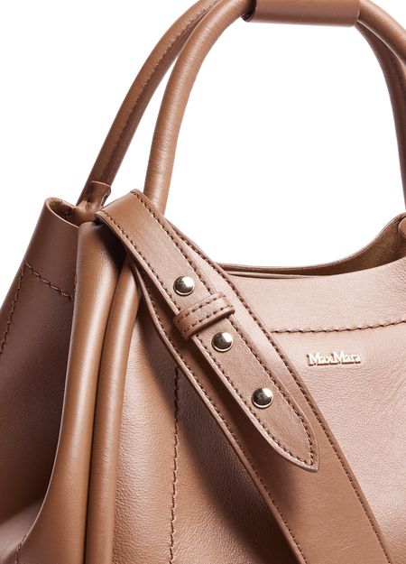 Reveal Max Mara's Marine handbag, a shoulder bag with double handles crafted from smooth leather. The leather handle and visible topstitching enhance its sleek design, while the front logo adds a touch of elegance.