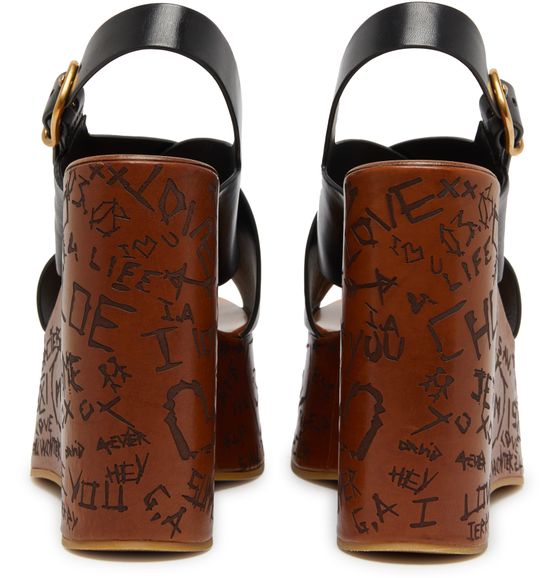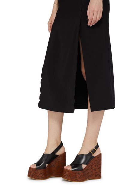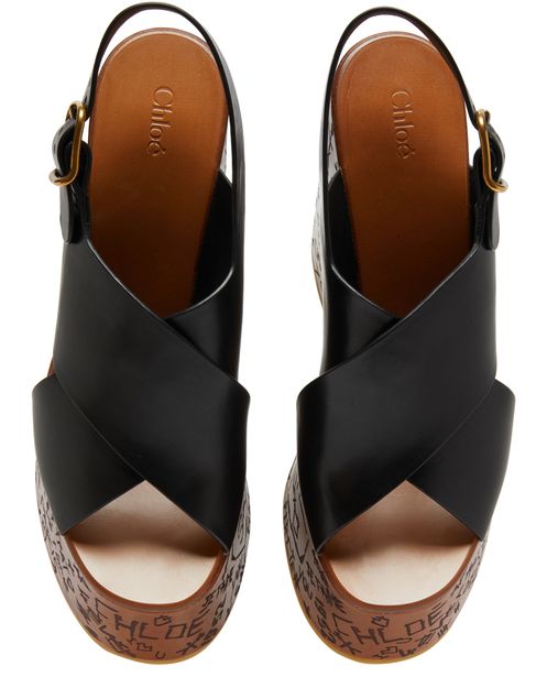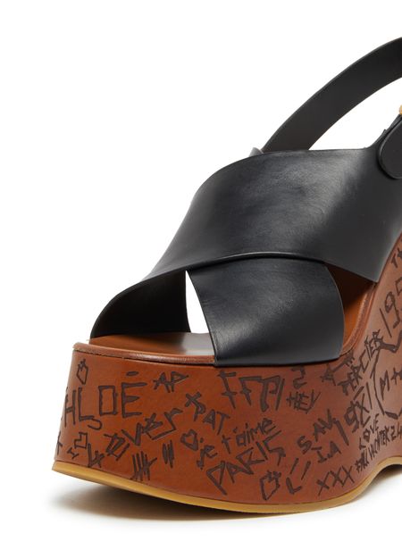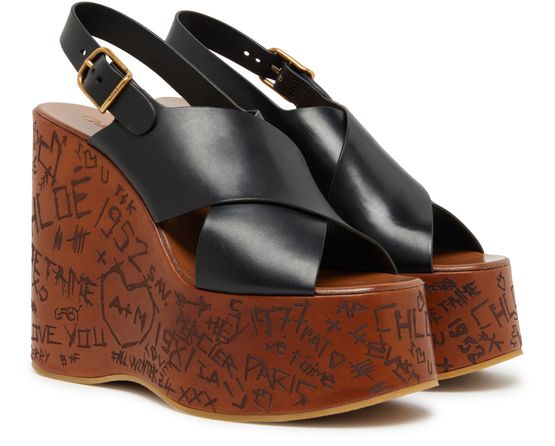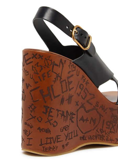 Chloé's Maxime wedge sandals showcase an elegant design with visible stitching and a buckled strap for a secure fit. The rear strap enhances support while the open round toe offers breathability. With a high wedge heel and a gold finish, these sandals elevate any outfit, complemented by a contrasting sole.