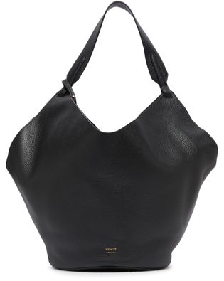 Khaite's Lotus medium tote bag showcases visible topstitching and a front logo, elegantly complemented by an engraved logo in gold letters. This single compartment shopper features a silver finish, a single handle, and a thin strap, making it versatile for hand carrying or worn on the shoulder for effortless style.