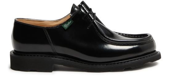 Introducing Paraboot's Michael derbies - a sophisticated blend of modern style and classic craftsmanship. These shoes feature a low block heel, an embossed logo, and a contrasting sole with visible stitching. The round toe and lace-up closure ensure a refined, yet comfortable fit.