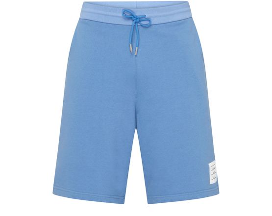 Thom Browne's mid-length shorts offer a stylish knee-length silhouette, featuring an elasticated drawstring waist for a perfect fit. With side pockets for convenience and a back pocket for essentials, the shorts proudly display an appliquéd logo and a logo on the side, merging functionality with signature elegance.