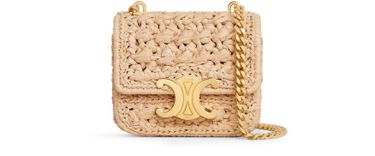 Reveal Celine's Mini chain Claude in raffia effect textile. This cross-body and shoulder carry bag boasts a Triomphe snap button closure and a sleek chain strap, perfect for a modern look. Its main compartment provides ample space for essentials, making it an ideal stylish accessory.
