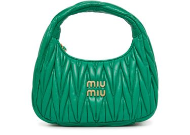 Miu Miu's Miu Wander hobo bag is crafted from chevron quilted leather with a metallic logo on the front. It features a gold logo in gold letters, a single handle for hand carrying or wearing crossbody, a zipper closure, and a padded texture with a gold finish.