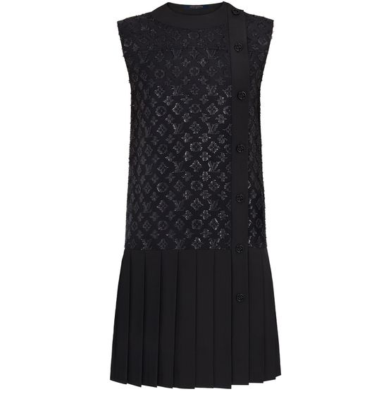 The little black dress with a Louis Vuitton twist: the iconic Monogram motif adds a refined signature to this straight-cut mini dress in this season's lurex jacquard finish. The new-season shape is trimmed with a feminine pleated skirt and a row of asymmetric Monogram flower buttons adding another subtle signature.