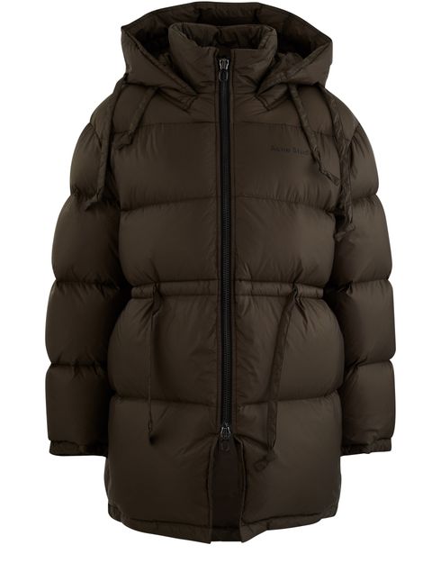 This oversize winter jacket is from Acne Studios. It features long sleeves, a stand-up collar and a hood. It fastens with a wide zip on the front and is finished off with an adjustable tie at the waist.