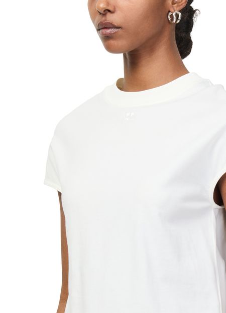 Reveal Courreges's oversized t-shirt, defined by its crew neck and cap sleeves for a modern silhouette. The short-sleeved design offers effortless versatility, pairing seamlessly with both casual and elevated looks. Its relaxed fit and refined details make this top a standout for any contemporary wardrobe.