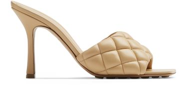 Bottega Veneta's Padded sandals are crafted from satin-finish leather with a quilted texture, combining luxury and comfort. The open square toe and pull-on design add a modern touch, while the stiletto heel exudes elegance. Perfect for adding a sophisticated edge to any outfit, day or night.