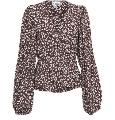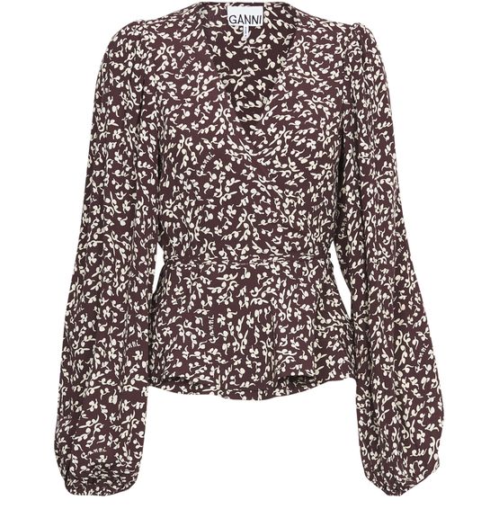 Women will love this figure-flattering wrap blouse from Ganni with its stylish arabesques and its flowing puff sleeves.