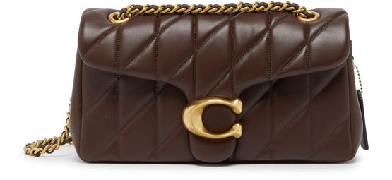Reveal Coach's Quilted Tabby shoulder bag 26, a mini bag with a magnetic flap closure, double handles, and a chain strap. Its front logo, engraved logo, and logo in gold letters add an elegant touch, while visible topstitching completes this stylish accessory, perfect for shoulder wear.