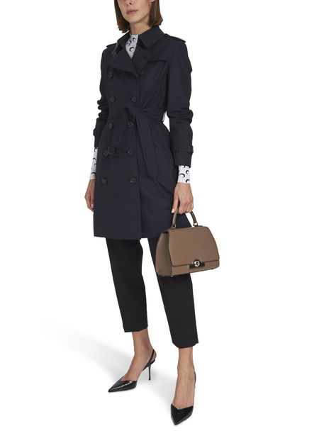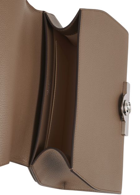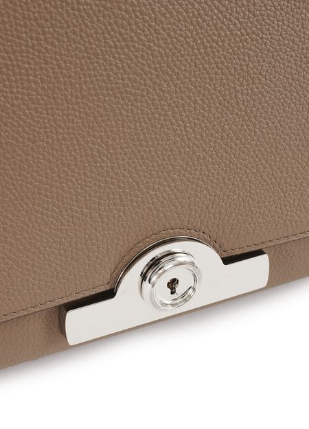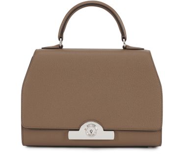 • Description : Leather handle, flap closure, engraved metallic logo clasp, metal with a silver finish.