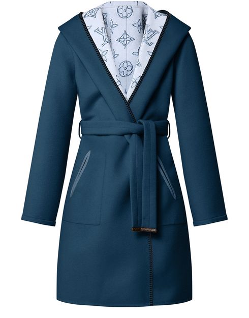 Chic and cozy, this reversible hooded coat is crafted in the House’s signature enveloping wrap silhouette from sumptuous cashgora. One side is left plain for a timelessly elegant look, while the reverse is delicately signed with a scaled-up Mahina Monogram jacquard. Contrasting blanket stitch completes the look with an understated graphic touch.