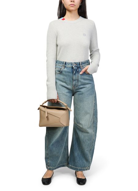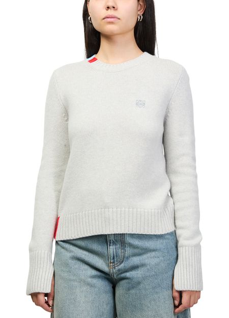 Reveal Loewe's round neck cashmere sweater, featuring an embroidered chest logo and long sleeves for a refined silhouette. The soft cashmere texture and classic neckline make this sweatshirt a versatile staple, perfect for layering or elevating everyday looks with understated sophistication.