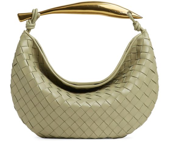 Bottega Veneta's Sardine bag is crafted from high-quality woven leather with a luxurious gold finish. It features a stylish carry handle and an embossed logo for a sophisticated touch. Designed to be worn in the hand, the bag's metal handle is meticulously crafted by artisans, making each piece unique with engraved marks and nuances.