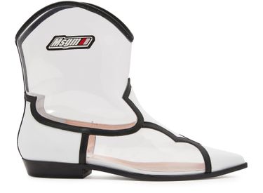 MSGM's bold spirit and inventiveness are on full display with these sheer ankle boots. The shoes were inspired by cowboy boots and feature multiple influences by blending American leisure and Italian elegance. The logo's graphic letters add an urban touch. They stand out thanks to their flexible, translucent material. Feminize these sneakers with a short, form-fitting dress and an oversized jacket.