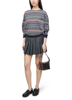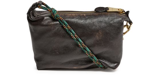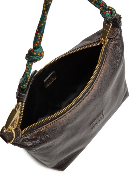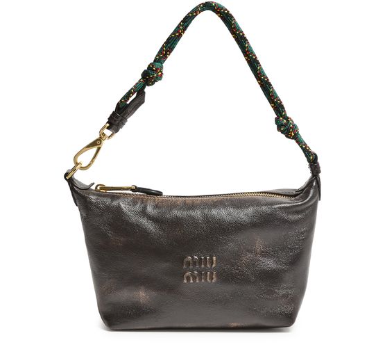 Reveal Miu Miu's shoulder bag with small round strap, crafted from distressed leather and adorned with metallic Miu Miu lettering. The embroidered strap and signature bi-color cord detail add a modern twist, while the gold finish and zipper closure ensure both style and security.