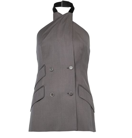 Reveal Max Mara's sleeveless double-breasted blazer, a short, collarless piece defined by its modern silhouette. Featuring a button fastening and flap pockets, this design offers two front pockets for added practicality. Its versatile style transitions seamlessly from day to night, elevating any wardrobe.