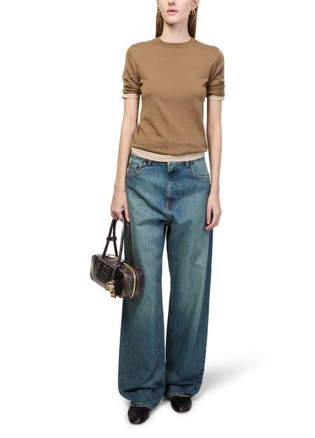 Reveal Miu Miu's Beau small aged nappa leather bag, crafted from distressed leather with a gold finish. The metallic Miu Miu logo and visible topstitching highlight its refined design, while double handles and a zippered interior pocket offer both style and practicality.