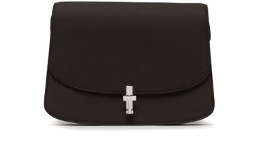 The Row Sofia 10 shoulder bag features a sophisticated flap closure and a sleek metallic logo on the front. With a thin strap and a single handle, it can be comfortably worn on the shoulder or crossbody. The silver finish adds a touch of elegance, while the zippered interior pocket offers practical storage space.