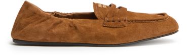 Introducing Miu Miu's soft suede loafers, a true embodiment of modern elegance. These chic loafers feature a closed square toe and a comfortable flat heel, making them perfect for any occasion. The visible stitching and logo-printed insole enhance their stylish appeal, while the logo on the tongue and gold lettering add a touch of sophistication.